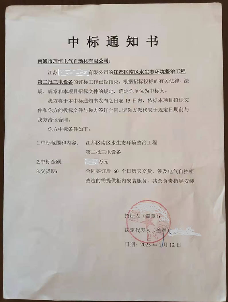 新春伊始,我司在江蘇某環(huán)保公司組織的“江都南區(qū)水生態(tài)環(huán)境整治工程第二批三電設(shè)備”的招標(biāo)活動中獲得中標(biāo),從而揭開了新的一年的生產(chǎn)經(jīng)營序幕,實現(xiàn)開門紅。